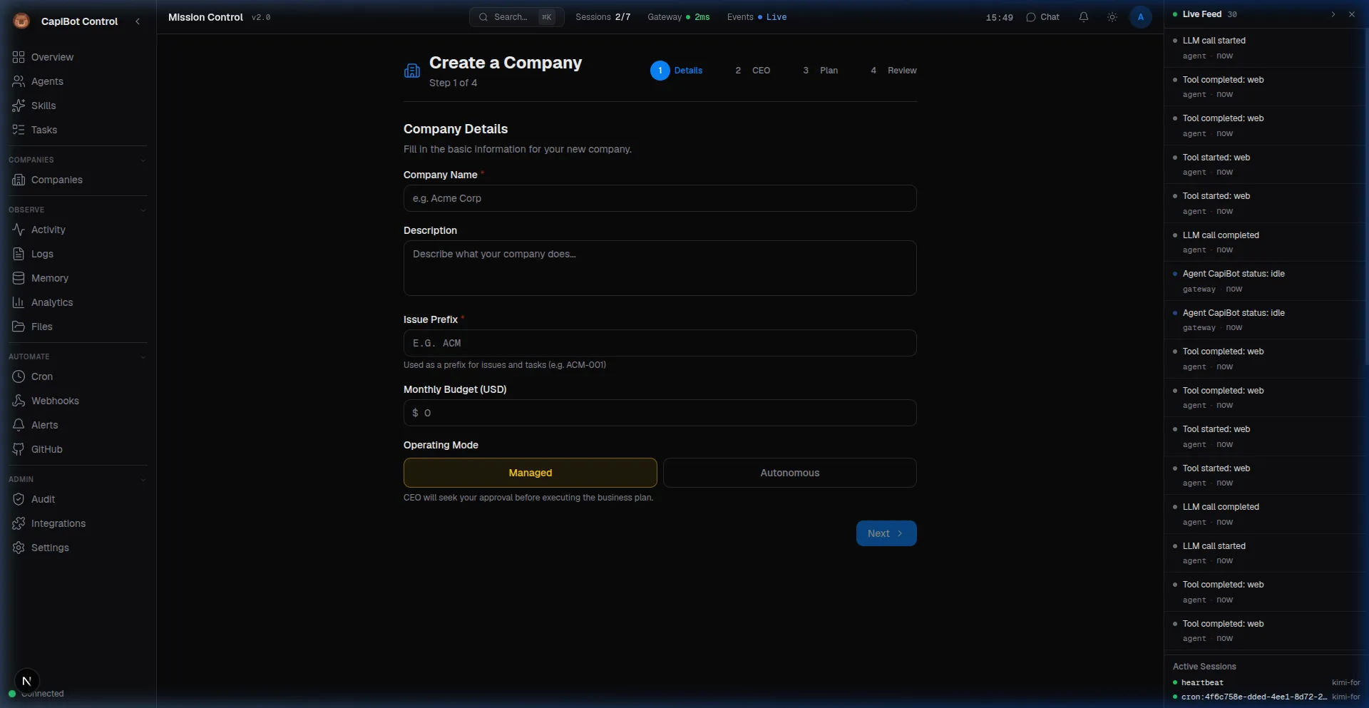 AI Companies are CapiBot's most powerful feature. They let you run autonomous organizations staffed entirely by AI agents, with as much or as little human oversight as you want.