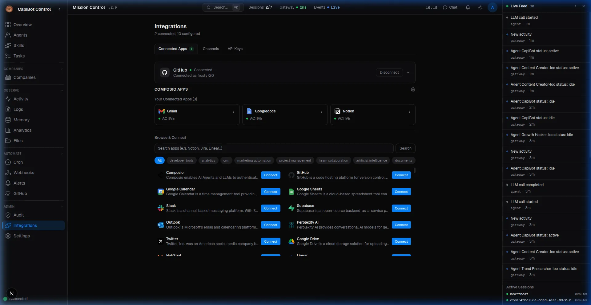 Connect CapiBot to the tools you already use. This guide covers setting up Composio for 1000+ app integrations and GitHub for repository management.