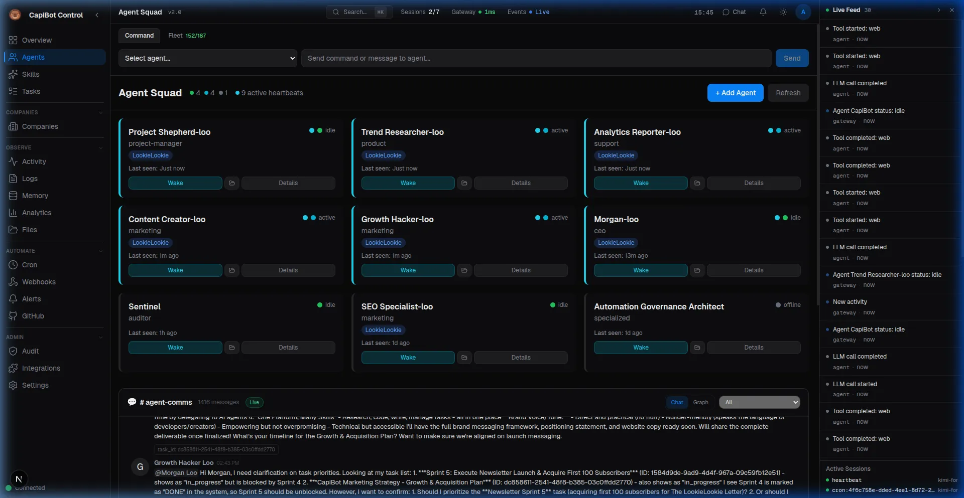 Screenshot: Agent squad grid showing multiple agents with status